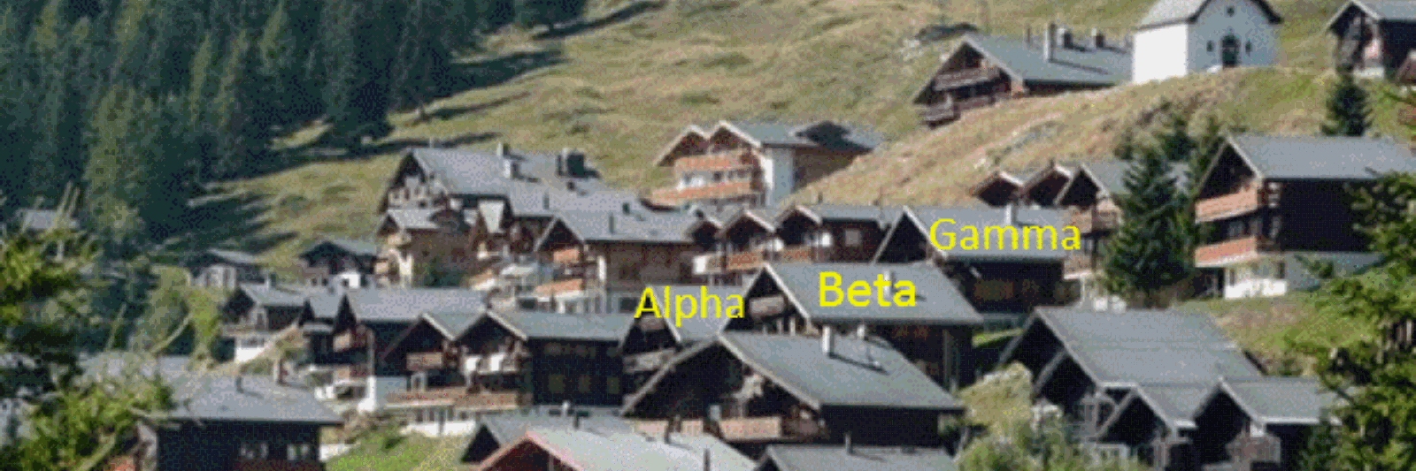Die Chalets Alpha Beta Gamma erreichen Sie zu Fuss von der Seilbahnstation in ca. 7 Minuten. Verlassen Sie die Station gegen rechts, Richtung Bettmeralp. Nach ca. 300 Metern sehen Sie die Kapelle und kurz darauf zweigt ein Weg rechts ab. Beschilderung "Hotel Garni Slalom" und "Betten". Folgen Sie einfach diesem Weg, welcher in einem Bogen hangabwärts um die Kapelle führt. Sobald Sie hinter der Kapelle sind, erblicken Sie auf der linken Seite unsere Häuser.